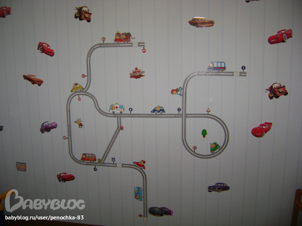 Там где наклейки с машинками, планировалась только дорожка. Но сыну так понравилось клеить, что они с мужем без меня поклеили вокруг тачки.