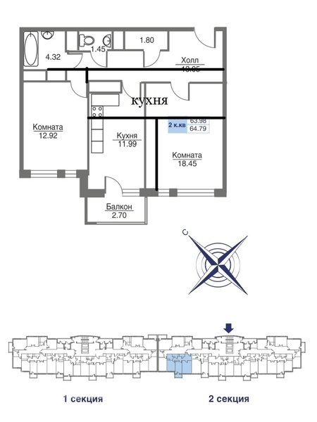 кухня будет в закутке - только для готовки. Часть комнаты 18.45 - верхняя - станет гостиной, но зону входа надо будет отделить от этого помещения.