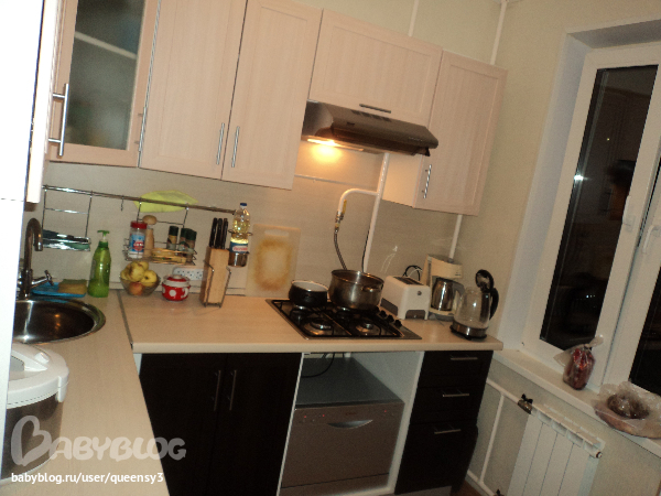 Сфоткать это всё разом нереально, т.е. пространство малюсенькое. Кухня 5,8 кв.м. Ну ничего, вдвоем вполне комфортно там поварешничать =)