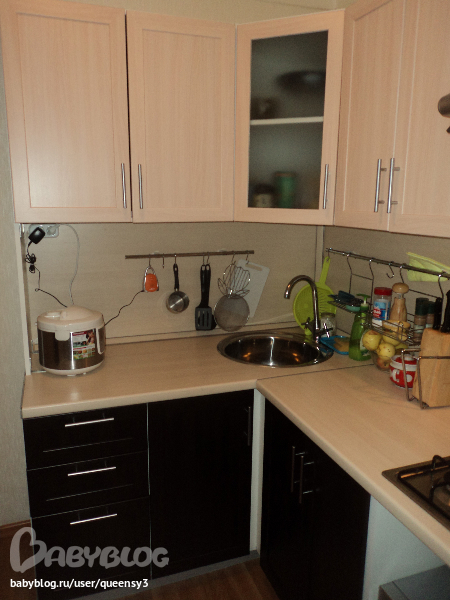 еще надо доработать - жалюзи, полки под мелоч сбоку привинтим, планку над посудомойкой для красоты такого же цвета как и низ)) Низ кстати не черный,а венге =))) мусорного ведра еще не нашли чтобы на дверь привинтить под мойкой ну и еще куча мелочи о которой думать не охота))))