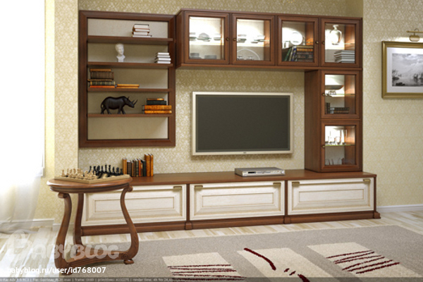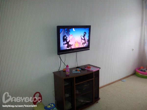 Я бы добавила потолочный плинтус, подушки на диван дополнительно в цвет потолка и на полосатую стену по бокам телика рамки тоже синего цвета, а вот тумба под теликом кажется маленько лишней.