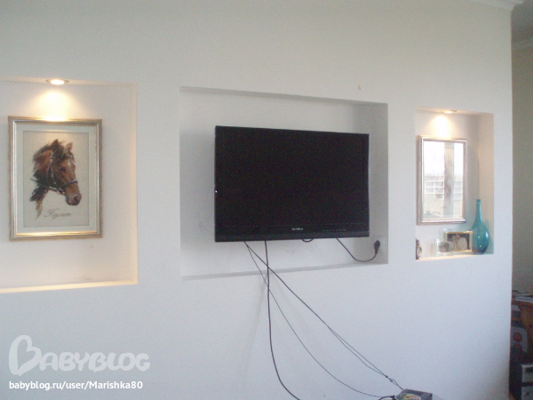 под телев. будет большая тумба под мелочи и аппаратуру. в углу ниша выглядывает, там буд мой уголок. буду туда на зааз делать шкаф секретер. с откидным столом. чтоб могла и в компе посидеть и рукоделие было чтоб куда разложить , книги, журналы. мечтаю о кресле качалки....