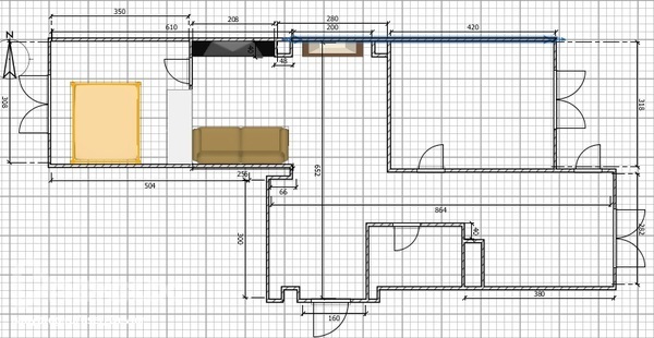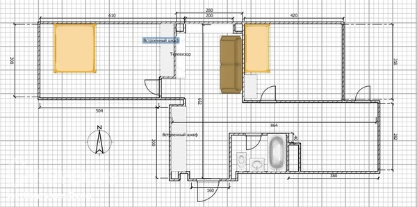 А с другой стороны можно также выстроить в углу полочки и консоль для тв напротив дивана. И спальня остается достаточно комфортной... Но будет ли оправдано это отрезания метра и выиграем ли мы пространство для гостей?