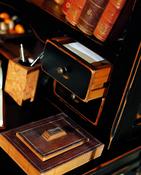 Вот он выдвигается глубокий ящичек, а внутри есть еще потайное отделение. И никогда не догадаешься, что ящик достается (если не знаешь, как устроен внутренний мир секретера). Иногда мастер того времени придумывал сложнейший механизм для отпирания потайных ящиков. Самый настоящий секретер из романов XIX века: