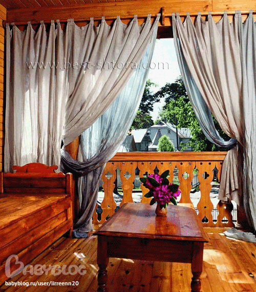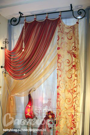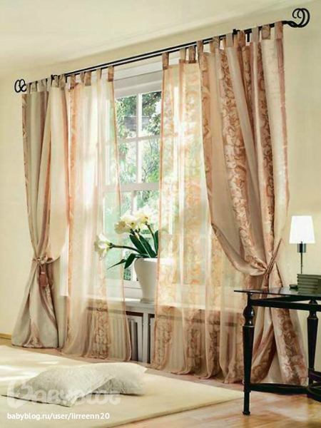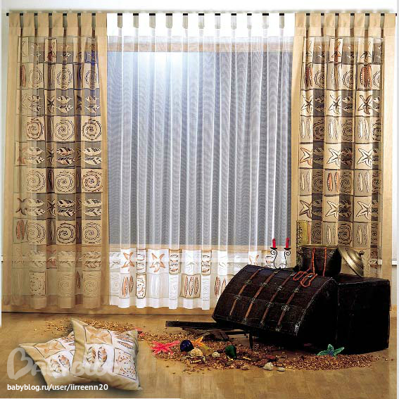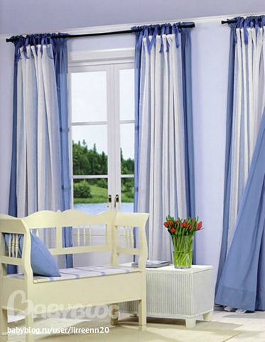 прелесть! я очень люблю шторы на петлях- вот мои в комнате- тюль покупная, а плотные шила сама из двух пледов.Обратите внимание- карнизы на разных уровнях...тоже сама придумала