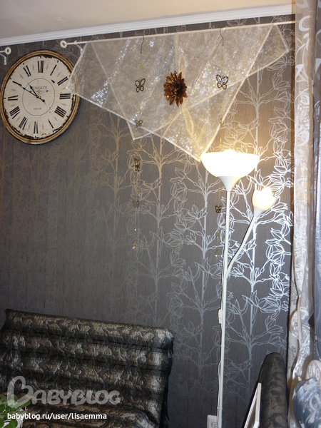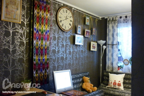 у меня два карниза на стене- слева висит пока ткань- хан-атлас- дочь привезла из поездки по Средней Азии
