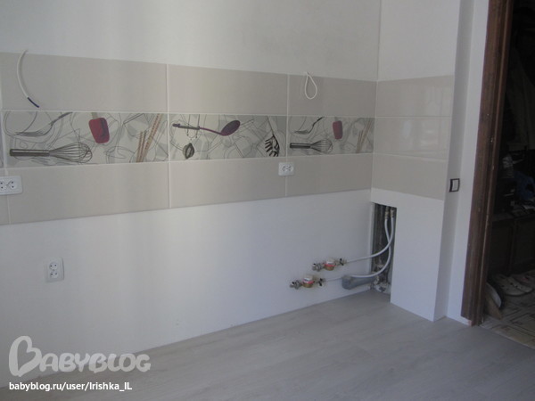 2. Все красиво относительно левого угла, но нет симметрии относительно плиты и вятяжки, + режем в правом углу плитку и выходит , что декор тоже порезан