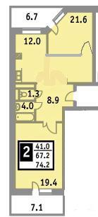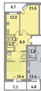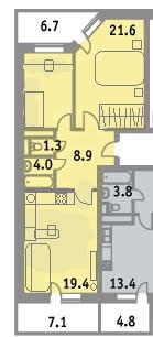 . Размер этого закутка, конечно, можно и больше сделать, и меньше... У меня лично сложилось ощущение, что хозяйка той квартиры просто не готовит, наверное особо.. Есть у меня еще одна мысль, но просто не знаю, как это с точки зрения согласований... Насколько я понимаю, "мокрую" зону на "сухую" поменять можно, а вот как наоборот.... Предполагала,что буду об этом задумываться через годик, когда буду помогать делать ремонт крёстной (квартира у нее подобная, только однушка) Короче говоря, из кухни тупо сделать жилую комнату (например, детскую, 12 м. - это не так уж и мало), из 21.6 - спальню, с гардеробными там всякими, чтобы уместились вещи (в т.ч. и детеныша, например, хотя бы верхние или несезонные, обувь - так как в коридоре места немного совсем), а вот из 19.4 - кухню-гостиную полноценную, с кухонным гарнитуром приличным. Вот тут -то и надо подумать про согласования. Воду и слив, я думаю, не проблема провести от санузла, если расположить кухню по стене напротив балкона. Ну вот что-то типа такого: