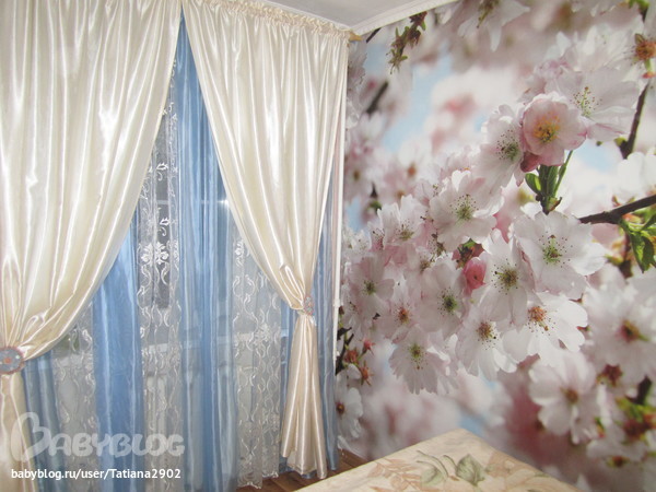 Сначала занялась спальней - малюсенькой прималюсенькой (не больше 8 кв.м.) и наклеила на центральную стену "Цветущую сакуру" (фирма "Комар") и при входе в комнату первое, что брасается в глаза - моя весна))) Муж разрешил сделать розовую спальню в обмен на "мужской" зал...