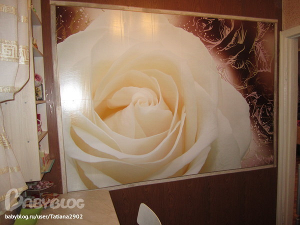 Кухня моя представляет собой малюсенький закуток площадью 5,73 кв.м. в котором непременно должно было быть всё для удобства хозяйки, в том числе и холодильник. Естественно, развернуться негде и если за стол садятся 3 человека - кухня реально заканчивается. На той стене, у которой стоит стол, от предыдущих квартирантов остались пластиковые панели с каким-то голубыми ромбиками и цветочками, которые меня ужасно раздражали! Смотрела я на них полгода, не решаясь что-то с ними сделать, а потом плюнула на все, купила наши русские фотообои за 250р. фирмы ООО ПКФ "БасС" с названием "Нежность", пленку самоклейку и начала творить с девизом "хуже чем было - уже не будет!" и вот что получилось))) Стена с розой замечательно сочетается с кухней в целом.