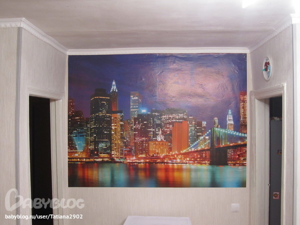 В результате на стенах появился мост (фотообои фирмы "Комар") и вид на ночной Нью-Йорк (какая-то российская фирма - не помню производителя). Так как интерьер до сих пор не закончен и представляет собой некую "солянку" из мебели по принципу "кто чего отдаст на халяву" - прошу смотреть только на фотообои)))) Основные стены было решено поклеить светлыми обоями.