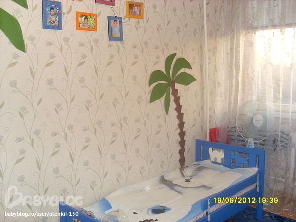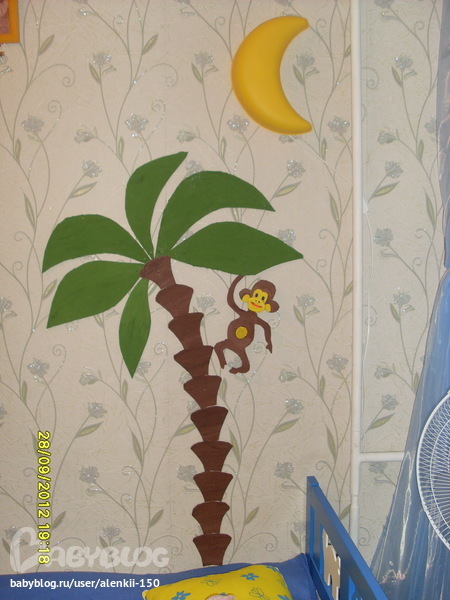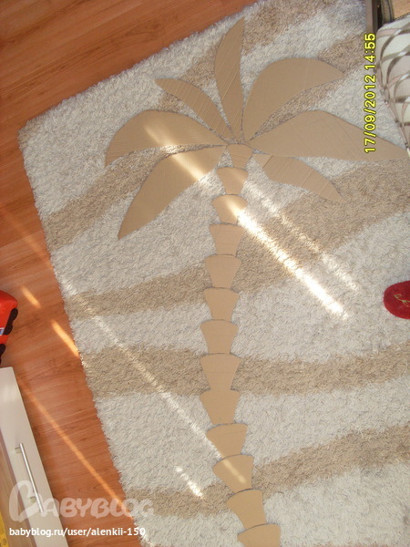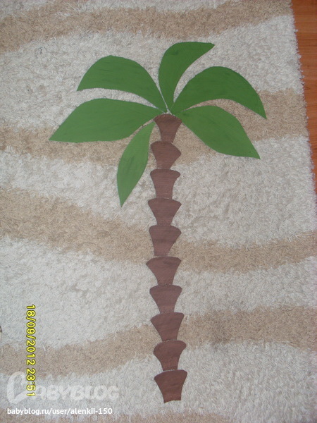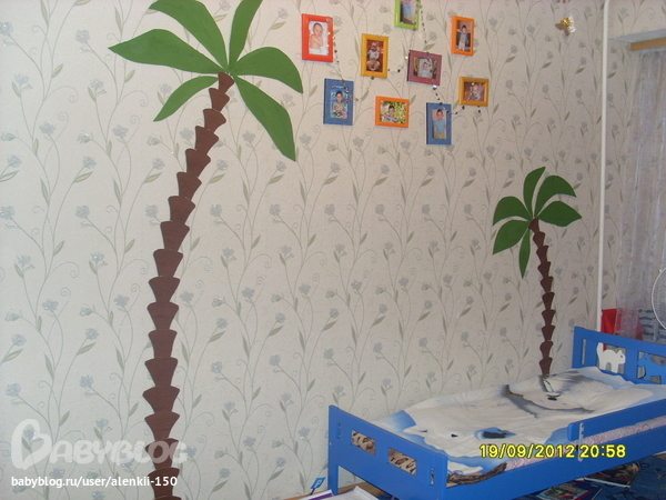 Интерьерное решение детской комнатыВ общем хочу поделиться своей идеей, может кому понравится кто любит hand made. Ремонт в детской будет не скоро, обои клеились до рождения ребенка, поэтому совсем не детские, а хочется чего то... ну так я о чем. Взяла из картонной коробки (не помню из под чего) нарисовала и вырезала пальму, вот таким макаром:
