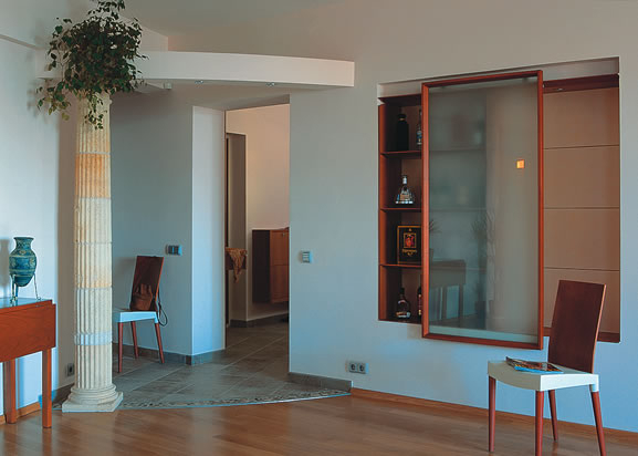 Классические колонны смотрятся в квартирах бутафорно, как театральный реквизит. Вот в данном интерьере: зачем она? Убери колонну и верхнюю гипсокартонную балку (или что это?), и вроде неплохо. Ниша здесь удачно смотрится.