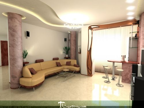 Ну здесь все: и колонна (2), волна непонятная на потолке. И диван этот тоже не подходит сюда (ни по дизайну, ни по размеру)