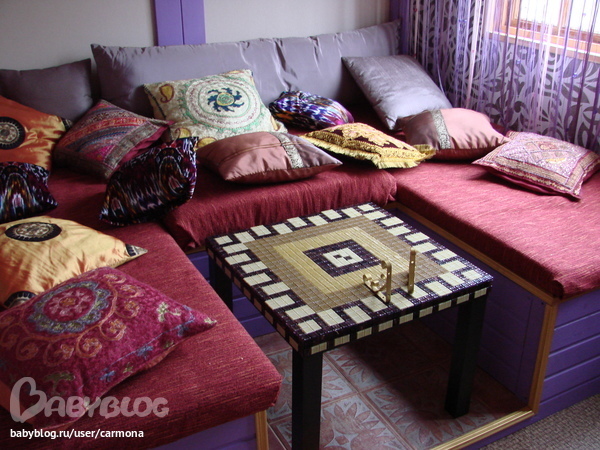 Столик сделала сама, стол из икеа, я на него плитку мозайку просто приклеела, можно было и не такой банальный рисунок сделать, но все же первая работа))))) Получилось весьма аккуратно и красиво)) Наволочки на подушки приобретались в разных местах, друзья-подруги, знакомые, заказывала часть и из Узбекстана.. Вообщем смотрите... Критикуйте, хвалите))))