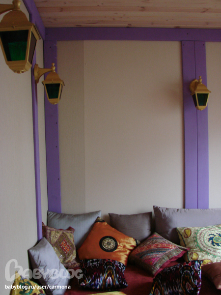 Нравится) люблю такие комнатки) только я бы всю эту зону сделала бы гораздо ниже, с низким столиком, короче почти на полу)) ну так чтоб совсем по-восточному)