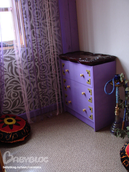 Красотища! Мне очень нравится цветовая гамма - фиолетовый с бордовым, или малиновым, в общем как у вас. Я себе кальянную именно в таких оттенках и представляла всегда)))