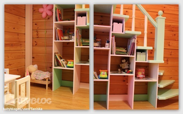 Под кроватью-чердаком удачно разместились книжные полочки и места для сна зайчика :) (В последствии там будет или болшой стол-парта или место для игры в домик: