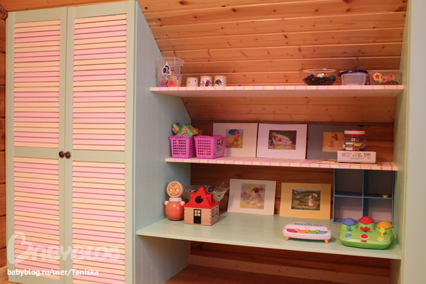 Наклейки дикаретто. Столик - икеа. При входе (высокая часть мансардного потолка) - лестница на кровать-чердак. Пока не используем, позже еще повесим сетку для безопасности.