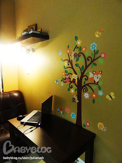 Виниловые наклейки клеились на бетонную стену (у нас нет обоев, просто краска), наклейки местами отходят от стены, так что когда прохожу мимо, не забываю пригладить рукой отошедшие уголки. Каждая веточка, листик, цветочек и пр. приклеиваются отдельно, мы около часа ломали голову какая ветка откуда должна расти, не смотря на то, что у нас был образец - фото готовой наклейки со страницы поставщика.