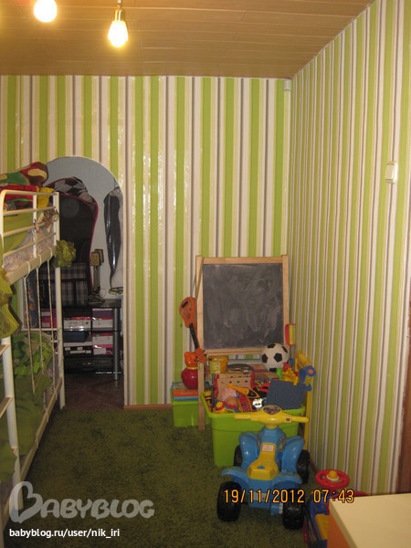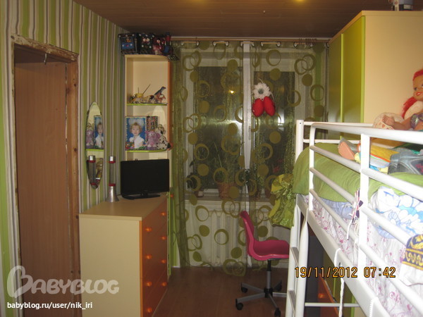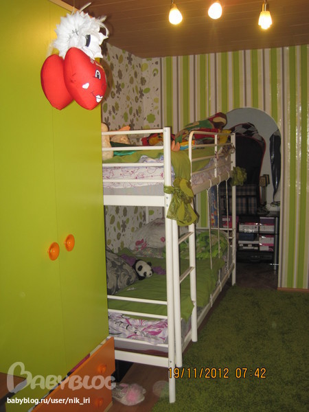 Читала комментарии других девочек, соглассна каждый делает так, как ему в угоду и нравиться и по карману. Я единствееное пока например если нет денег, то перекрасила бы стены, хотя бы так, в однотонный цвет, просто когда красишь однотонным, то пространство увеличивается, зрительно. А в целом мебель у вас веселая, как раз деткам, но пространства маловато, поэтому я бы сделала так.