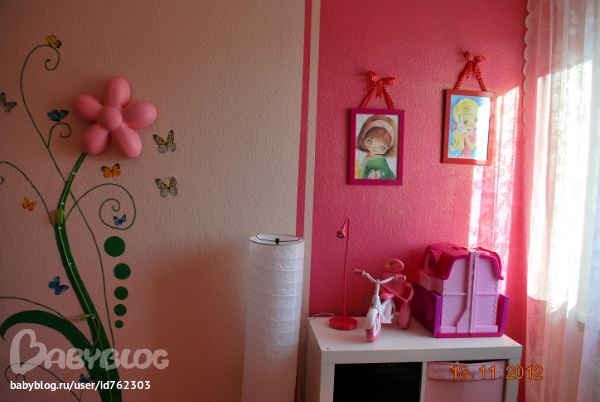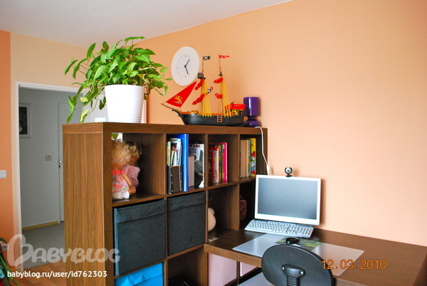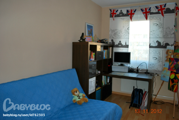 У сына в комнате не достаёт ещё коврик,просто не нашли пока подходящий.Над диванчиком планируется что-то вроде полочки для размещения его работ.Да шкафа в его комнате нет, но естъ один на двух в комнате дочки.