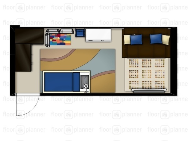шкаф ваш угловой. Диван двухместный, я взяла средний размер по ширине спального места 150 - соответственно и 140 уместится, и 160 и больше. Напротив телевизор на стене, под телевизором может быть место для хранения ввиде низкой тумбы, любой длины. Вообще там мини-стенка уместится. Не обязательно прям стенку, ну суть в том, что та стенка для хранения. Справа по картинке от дивана - прикроватный столик. Здесь он показан, как двойной, вот типа такого из икейского исполнения http://www.ikea.com/ru/ru/catalog/products/10135027/ так же бывают варианты http://www.ikea.com/ru/ru/catalog/products/30208447/ или на колесиках http://www.ikea.com/ru/ru/catalog/products/50208451/ назначение - прикроватная тумба, журнальный столик, доп. место для хранения и столик для игр ребенка. В исполнении 2 или 3 в 1 все перемещается в любую зону автономно. На колесиках просто мобильный столик.