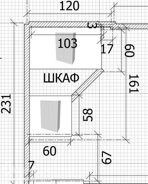 блин, поняла про шкаф. он угловой 103 по одной стороне, 161 по другой. Значит двигать его больше некуда. Пардон, не разобралась сразу в схемке:)
