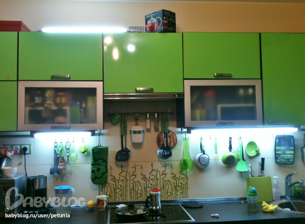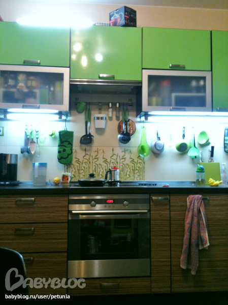 Ооо! Супер! Это ж надо же так подобрать все принадлежности с зелеными ручками, солонку/перечницу зеленую, прихватки, даже вокруг розеток (увидела!;)))... Супер! И рамочки как оформлены вокруг часов, и картинки "бамбуковые"... Супер! Молодец!