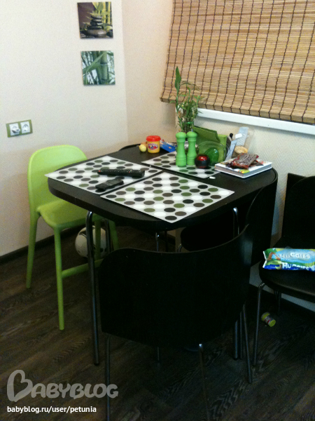Зелененькая) классный цвет_ очень позитивный) а стульчик, за столом высокий) это просто барный стул или детский_ а тто у нас Данька на своем уже не особо сидит стуле, а на взрослом ему еще низковато(