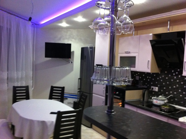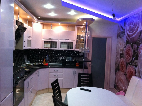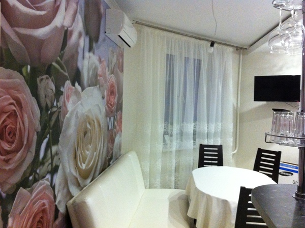 если бы кухня была в стиле прованс, то розы вписались бы. На мой взгляд на стену нужно было бы наклеить черно-белый рисунок, геометрия потолка и комнаты диссонируют( нужно было бы либо повторить контур комнаты, либо отказаться от коробов вообще. шторы опять же ближе к стилю прованс, я бы повесила рулонные. не обижайтесь, но тут на вкус и цвет)