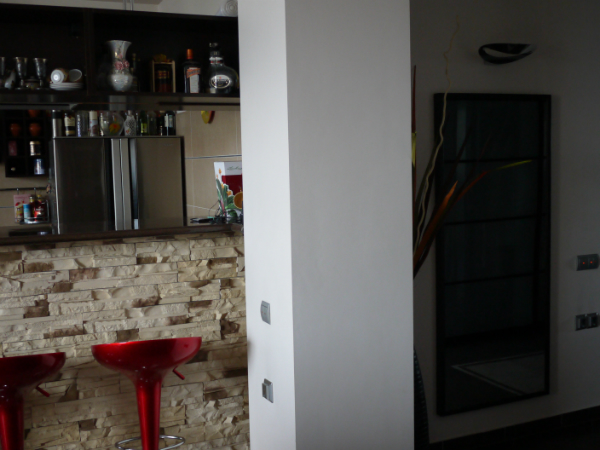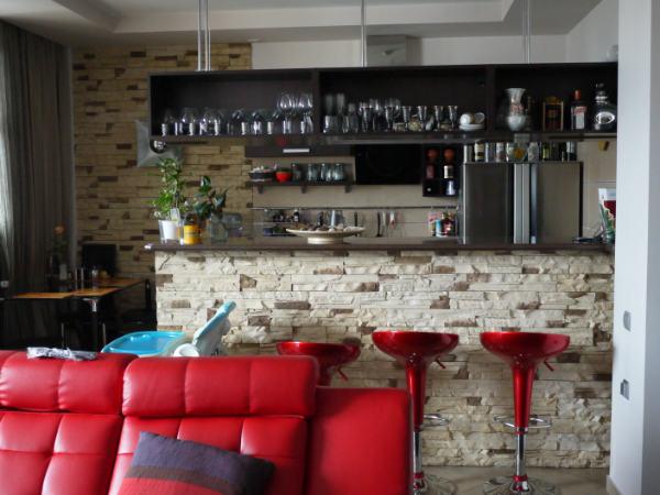 Ну и вид в кухонную сторону. У нас студия, если читали предыдущие посты. Барные стулья подобрали также яркокрасного цвета. Только Егорин стул голубой - не гармонирует)