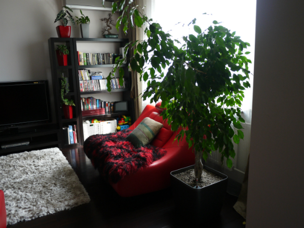 Кресло у окна. На кресле овечья шкура крашенная. Диван и кресло - красные. Цветочные горшки, кстати, все в этом годлу заменила на одинаковые - одной фирмы. Все красные и серые. Мне нравится как в итоге получилось)))