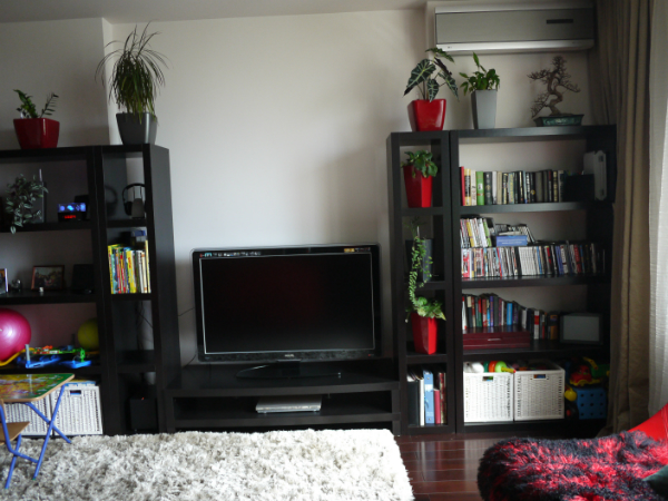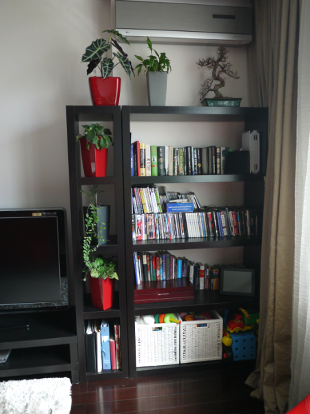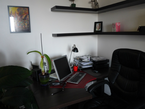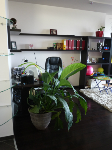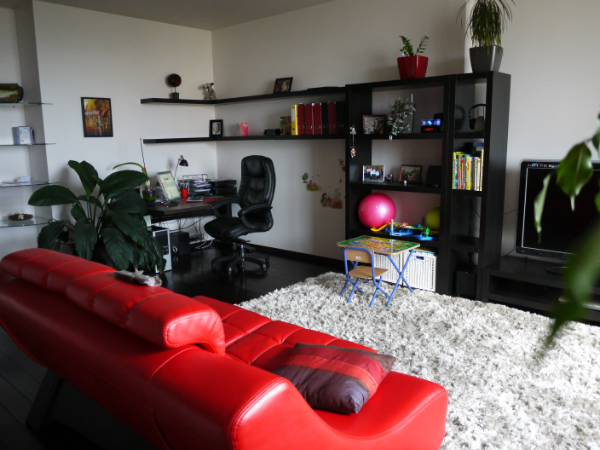 вот собственно деловая зона, цветок отделяет ее. Поначалу хотела поставить туда большое дерево, но в этой части комнаты уже темновато, поэтому спатифиллум - теневыносливое растение только тут и прижился. Стены под покраску плюс полки и стелажи - основной интерьерный компонент гостиной. Паркетная доска темная, как и стелажи, в связи с чем положили светлый мохнатый ковер, дабы оттенить.По цветовой гамме хотела использовать два основных цвета - темный венге и красный.Но дети добавили красок)))