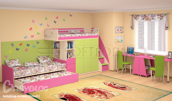 У нас так будет через год (младшая пока спит у нас в комнате). Комната 18 метров, зонировали, одна половина комнаты для старшей, вторая для младшей. Просто я не призню двухэтажные кровати.