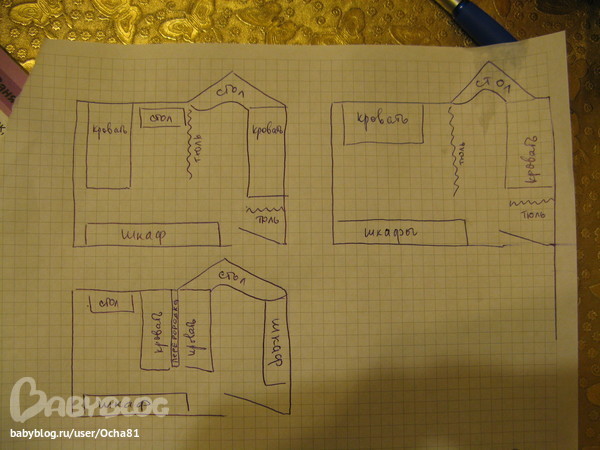 зачем отдельный пост?))) у вас интересные идеи)) У меня такая планировка, как у вас нижний рисунок, шкаф уже есть встроенный справа от двери, вот тоже думаю, как лучше поделить, да ещё и чтобы телек им общий смотреть)) но это по-моему не реально.. А почему вы не хотите двухярусную кровать? я бы ещё подумала, а муж у меня тоже категорически против..