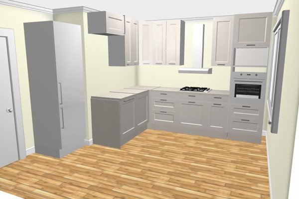 техника будет другая, мойка в угловом по короткой стене, крылом в угол, холодильник встанев слева в нишу у двери.