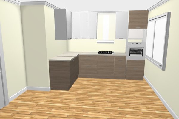 Микроволновку (обычную) попробую запихнуть над духовкой. Еще телевизор планирую по левой стене там где шкафы оборвались, и может, открытые полки.