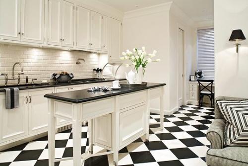 Когда у меня была белая кухня, то отлично подошла плитка бы черно-белая мраморная. Тоесть одна белая, другая черная. Но у меня была не плитка, а линолеум, дорого обошлась нам, но смотрелась как плитка мраморная. Никто даже на ощупь ногами не мог понять, что это линолеум, только пощупав делали свои выводы.