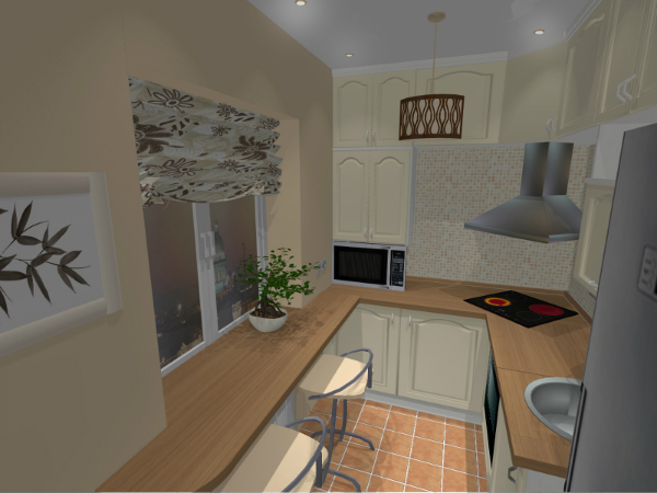 Я бы поставила микроволновку в противоположный угол где варочная, а варочную панель перенесла на сторону где микроволновка. Стол бы я не стала после окна на стенке продолжать.