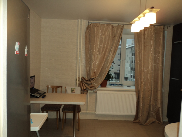 Красивая очень выстраданная кухня!))) Вы сейчас просто опустошились и поостыли к ней потому что устали)) А нук соберитесь, осталось то всего ничего! Мне кажется штора что у Вас сейчас оч хорошо впишется, но на чуть удлиненном карнизе, подрезанная по длине и разбавленная легкой светлой тюлью (я б вообще повесила а-ля из органзы бежево-коричневой во всю стену... Или так не делается уже, 17 век?))) У меня в комнате, нашей спальне, так висит: и трубы закрывает и воздушненько) Ну или роллеты, просятся зеленые (уже наверное классика молочный и беж комбинировать зеленым)...