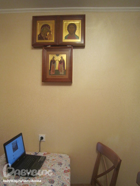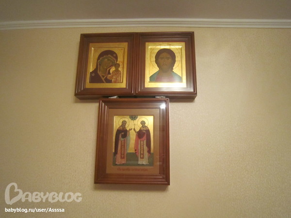 Хоть и поздно но покажу свое у на висят Венчальные иконы вот так, фото хоть и не очень удачное но как то так, очень уютно смотрится. особенно под деревян кухню