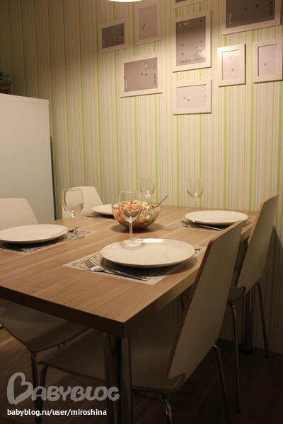 у нас кухня в процессе, стены тоже светло фисташковые, так как гарнитур оранж с серым, стена у нас возле стола поклеена фото обоями, ну и телек висит, пока не все готово