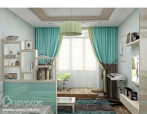 или вот так, тут правда синий цвет, но вместо синего можно использовать и бирюзовый (как вариант для дизайна штор, можно и наоборот, верх бирюза, низ беж.)