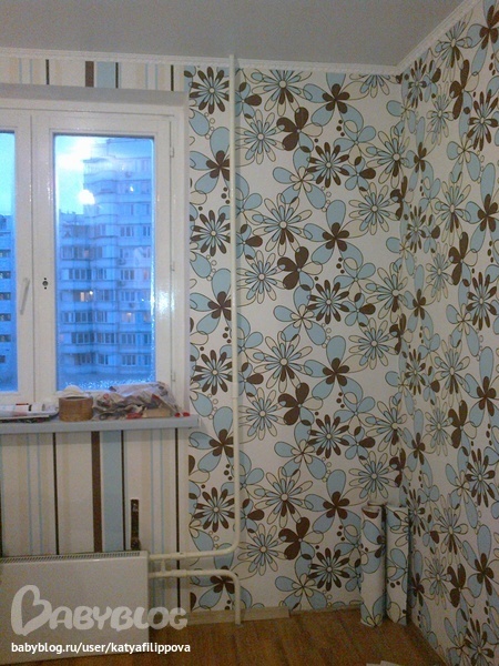 Одна стена цветы,вторая полоски,и две стены однотонные.Комната самая светлая в квартире,хоть и окно не большое.