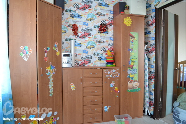 Я бы обои машинки только в одной стене сделала бы и наклейки со шкафов надо убрать. Очень всего много.