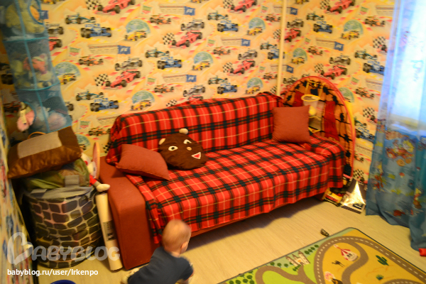 у нас квартирка маленькая, а комнатка вообще малепусенькая. Когда стоял диван, если его разобрать, то всё, в комнате места нет для игр.Потолки низкие. Поэтому искала варианты. А сейчас в комнате есть место для игры, так что все игрухи перенесли в детскую комнату.