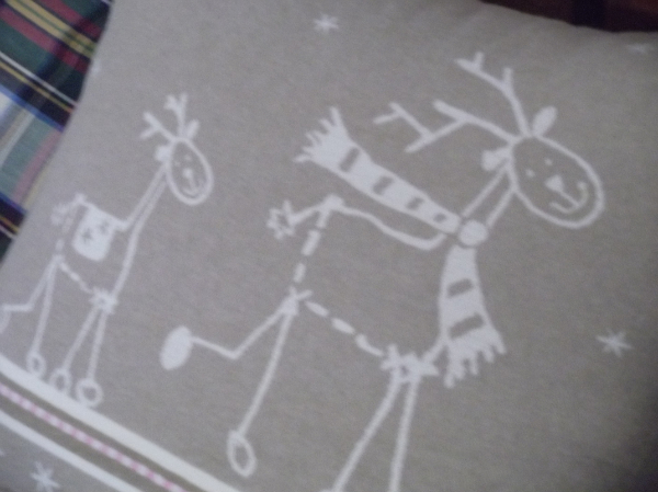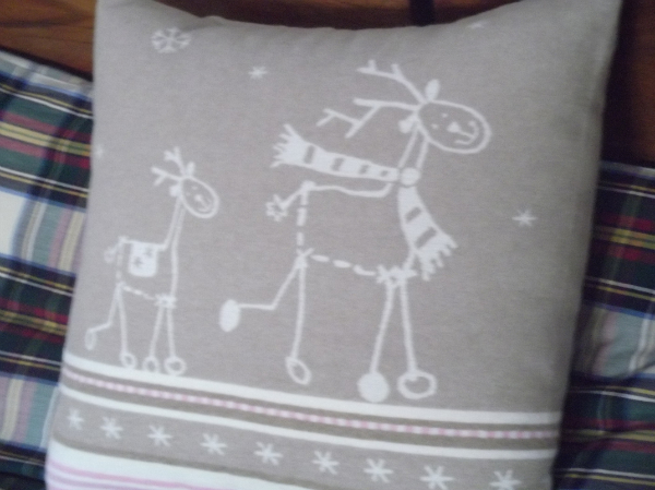 оленью (семейную) подушку и водрузила ее в спальне. Очень мягкая и нежная (и не только из-за рисунка). На кофейном фоне мама (папа) олень и сынок. Это Австрия, текстиль DAVID FUSSENEGGER. Хлопок 85 %, вискоза 8% и акрил7%.