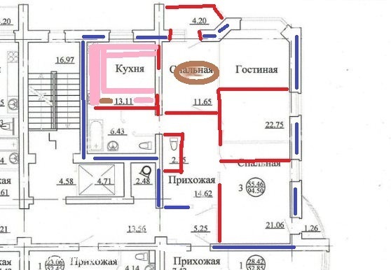 розовое это кухонный гарнитур,стол нарисовала)))) ну все образно конечно...комнаты по моему ривунку становятся примерно: кухня 13метров, столовая+гостинная 23метра+4.20 утепленная лоджия,спальня 16 метров и вторая тоже столько же (но во второй масенький декоротивный дурацкий балкон -его не утеплить и что с ним делать вообще незнаю)