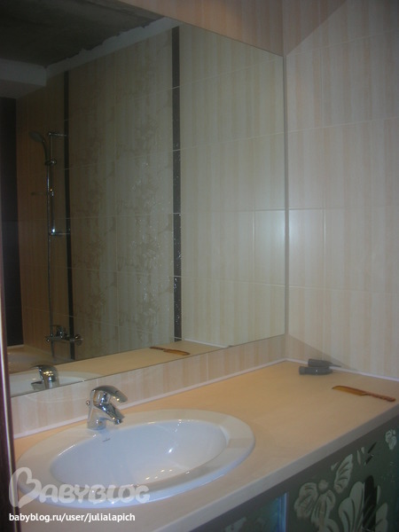 на столешницу поставили раковину, такую которая просто сверху ставится. (круглая) и кран классный у них - высокий такой !!! но больше всего мне пнравилось - это то что стиралка у них получилась встроенная (как на кухне вышло) - те она под раковиной, и в шкафу!! очень классно ))